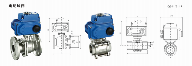 法兰电动球阀主要外形及连接尺寸(单位:mm)